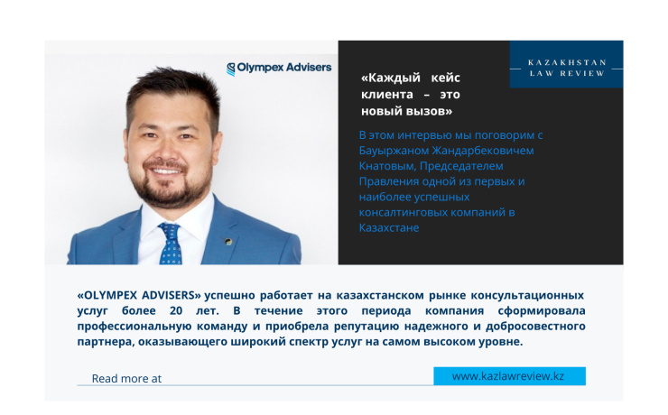 Недавно вышло интервью в журнале «Kazakhstan Law Review» с Бауыржаном Жандарбековичем Кнатовым, Председателем Правления компании «OLYMPEX ADVISERS». В этой статье он делится своим профессиональным путем, начиная с работы стажером и завершая лидерством в компании. Бауыржан Жандарбекович подробно рассказывает о специализациях и достижениях OLYMPEX, включая признание